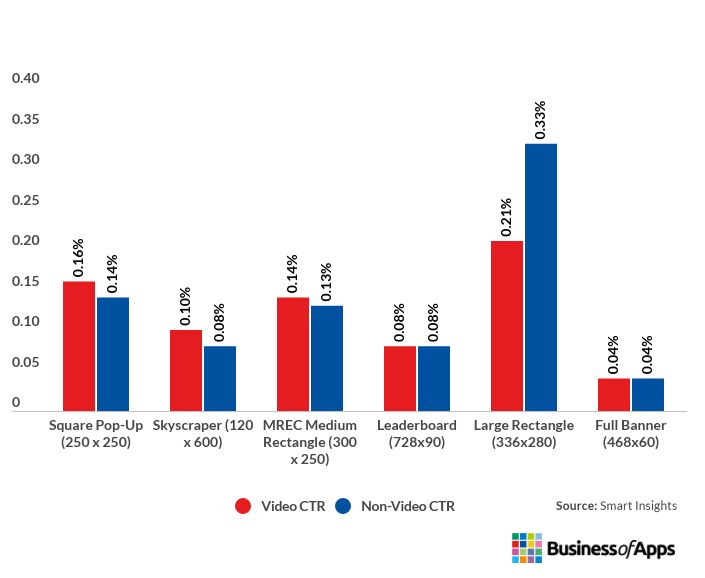 Clickthrough rates often vary based on the ad format, content, and placement. Often, traditional full-banner mobile ads tend not to perform as well as skyscrapers or the more common MREC formats.